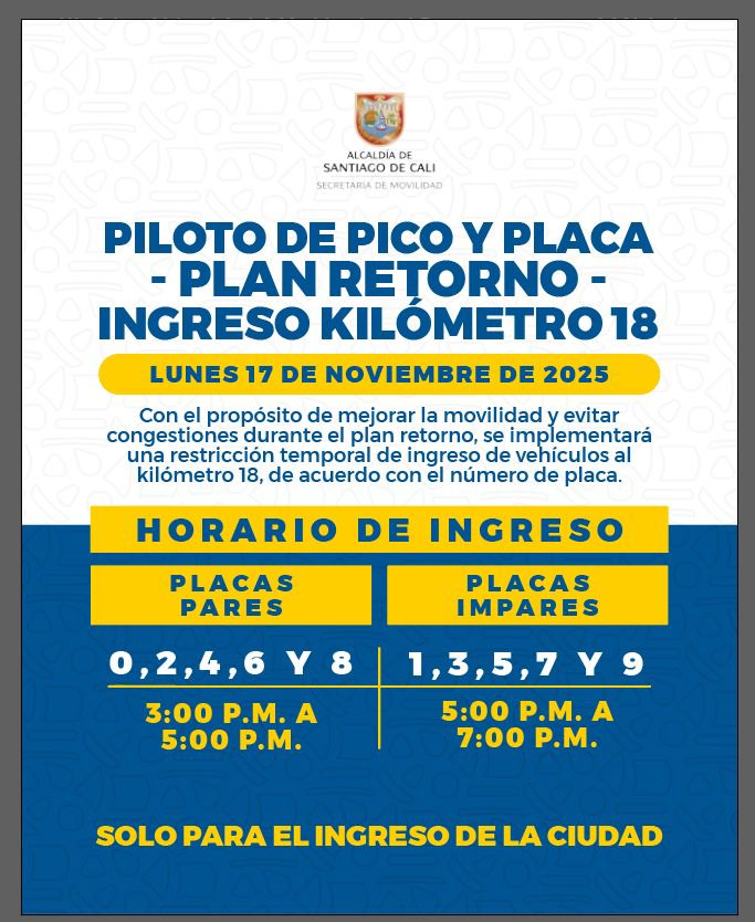 La Secretaría de Movilidad Distrital confirmó que el próximo lunes festivo, 17 de noviembre, se pondrá en marcha un plan piloto de ‘pico y placa’ sobre el corredor del kilómetro 18, en la Portada al Mar, con el objetivo de mitigar el caos vial que se presenta en el ingreso a Cali durante días de alta afluencia.