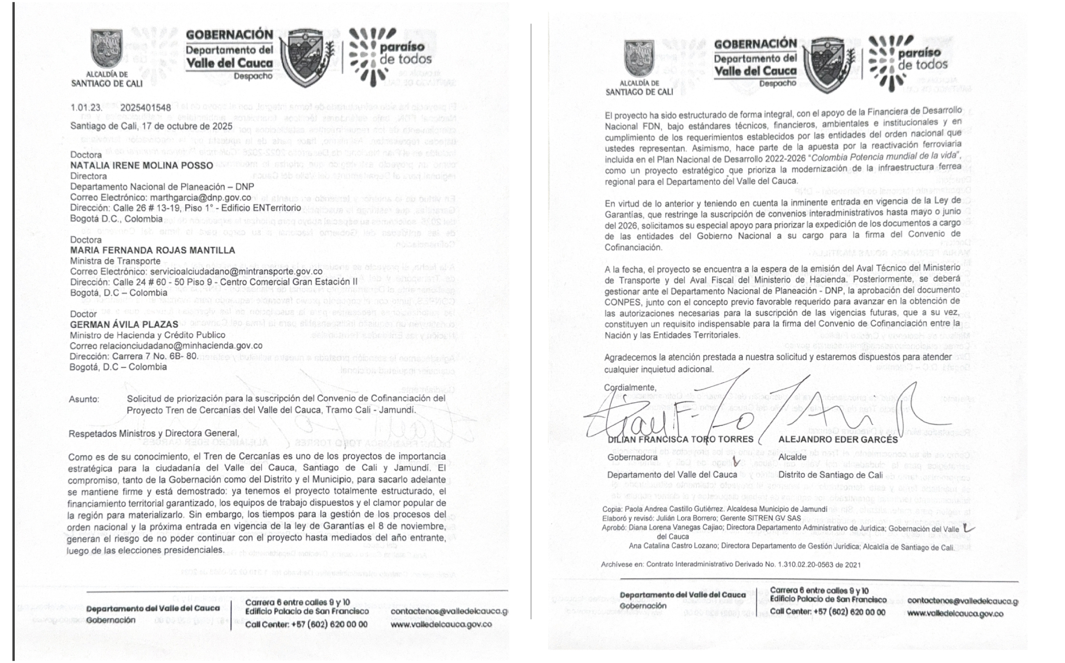 A 17 días del inicio de la Ley de Garantías, la gobernadora del Valle del Cauca, Dilian Francisca Toro, y los alcaldes de Cali y Jamundí enviaron una carta al Gobierno Nacional para exigir la firma del convenio de cofinanciación del Tren de Cercanías, que garantizaría los recursos para su primer tramo entre Jamundí y Cali.