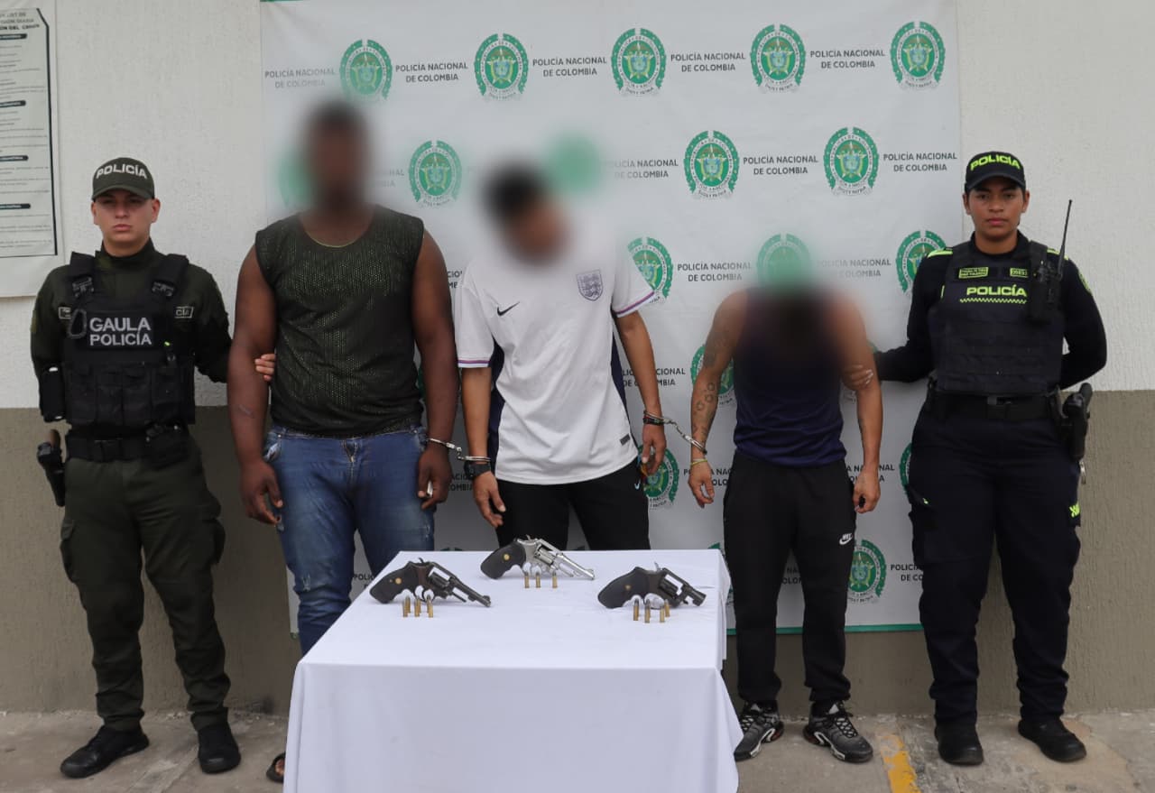 El balance preliminar dejó tres personas capturadas en flagrancia por porte ilegal de armas de fuego. Durante el procedimiento fueron incautados tres revólveres con su respectiva munición, un chaleco balístico, 2.500 dosis de marihuana y 30 armas cortopunzantes.