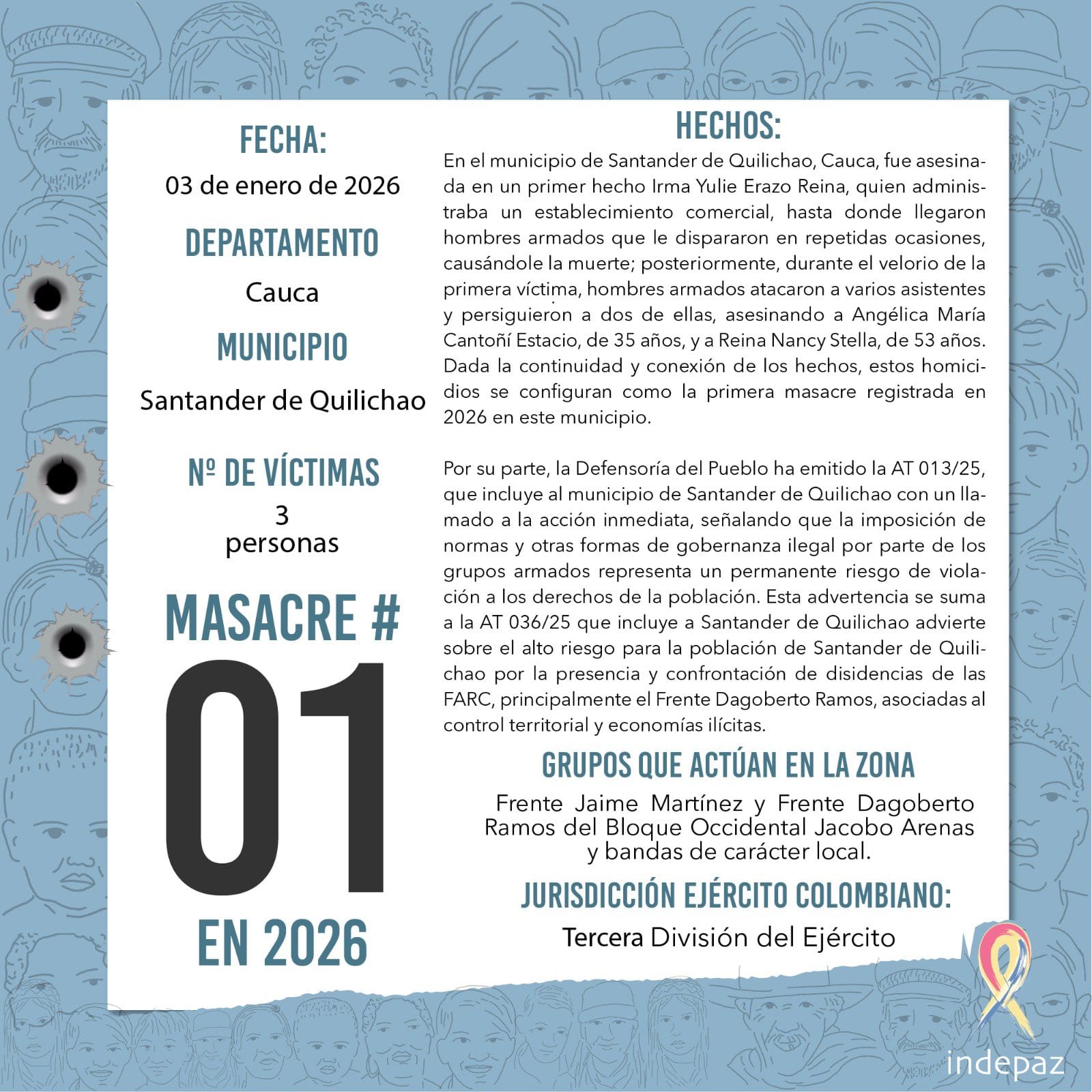 El país registró su primera masacre del año 2026 en el municipio de Santander de Quilichao, al norte del Cauca, donde tres mujeres fueron asesinadas en una secuencia de hechos violentos ocurridos el pasado 3 de enero, en pleno casco urbano.